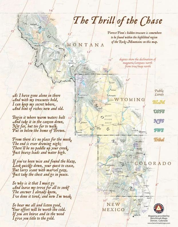 Il aura fallu plus de dix ans pour que le trésor caché « sous la voûte étoilée, dans la végétation forestière luxuriante des montagnes Rocheuses » soit retrouvé. Forrest Fenn, marchand d’art et auteur, avait publié en 2010 une collection d’histoires courtes autobiographiques. L’ouvrage comporte notamment un poème de 80 lignes nommé « The Thrill of the Chase », traduisible par « le frisson de la chasse », censé mener à un fabuleux trésor. L’ancien pilote de l’armée de l’air américaine, guéri d’un cancer pourtant diagnostiqué en phase terminale, voulait « donner de l’espoir » aux lecteurs de son ouvrage avec la promesse d’une captivante chasse au trésor. Le poème comportait neuf indices, imitant le journal du père d’Indiana Jones conduisant au Graal, et se terminait ainsi :